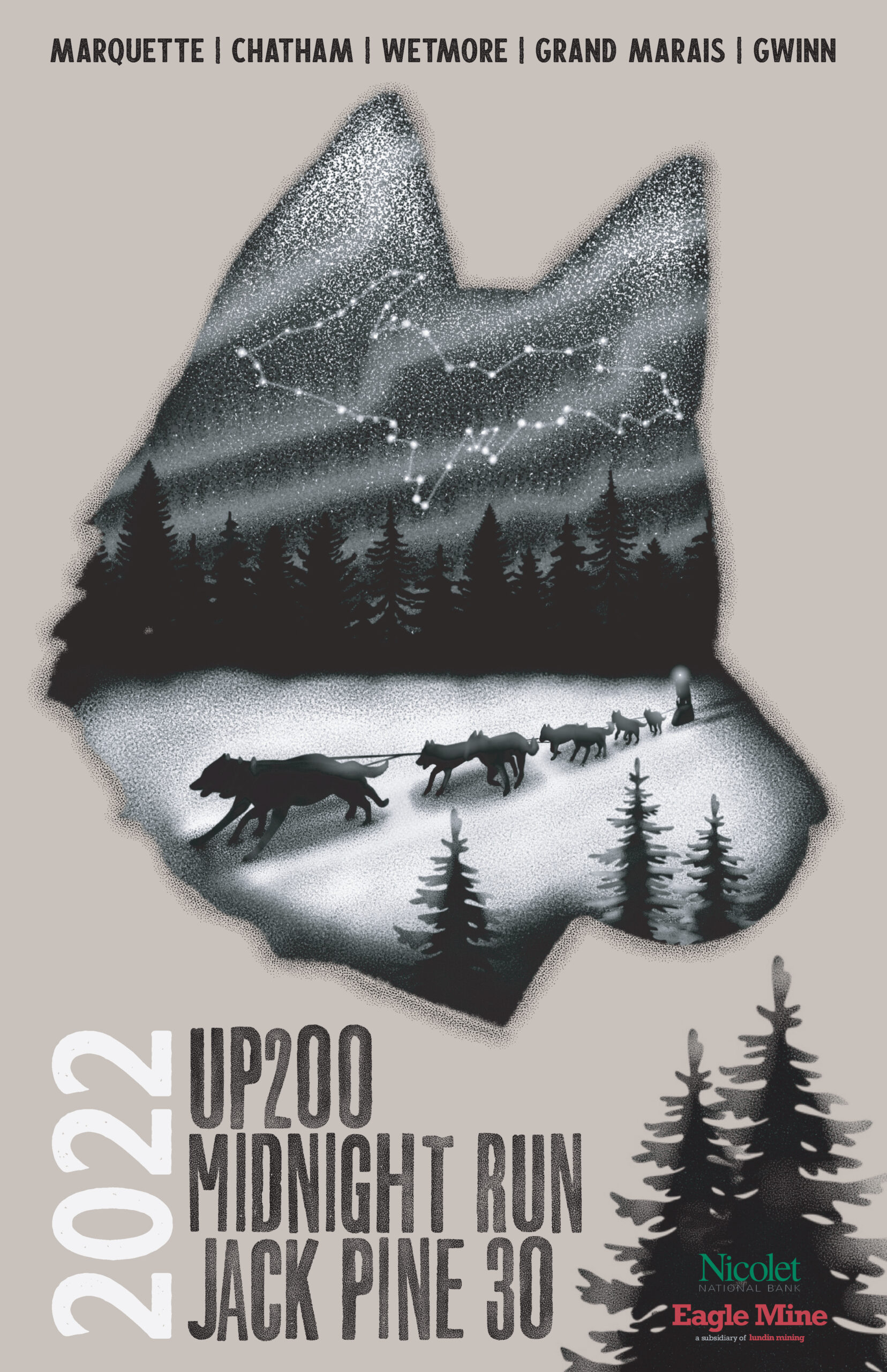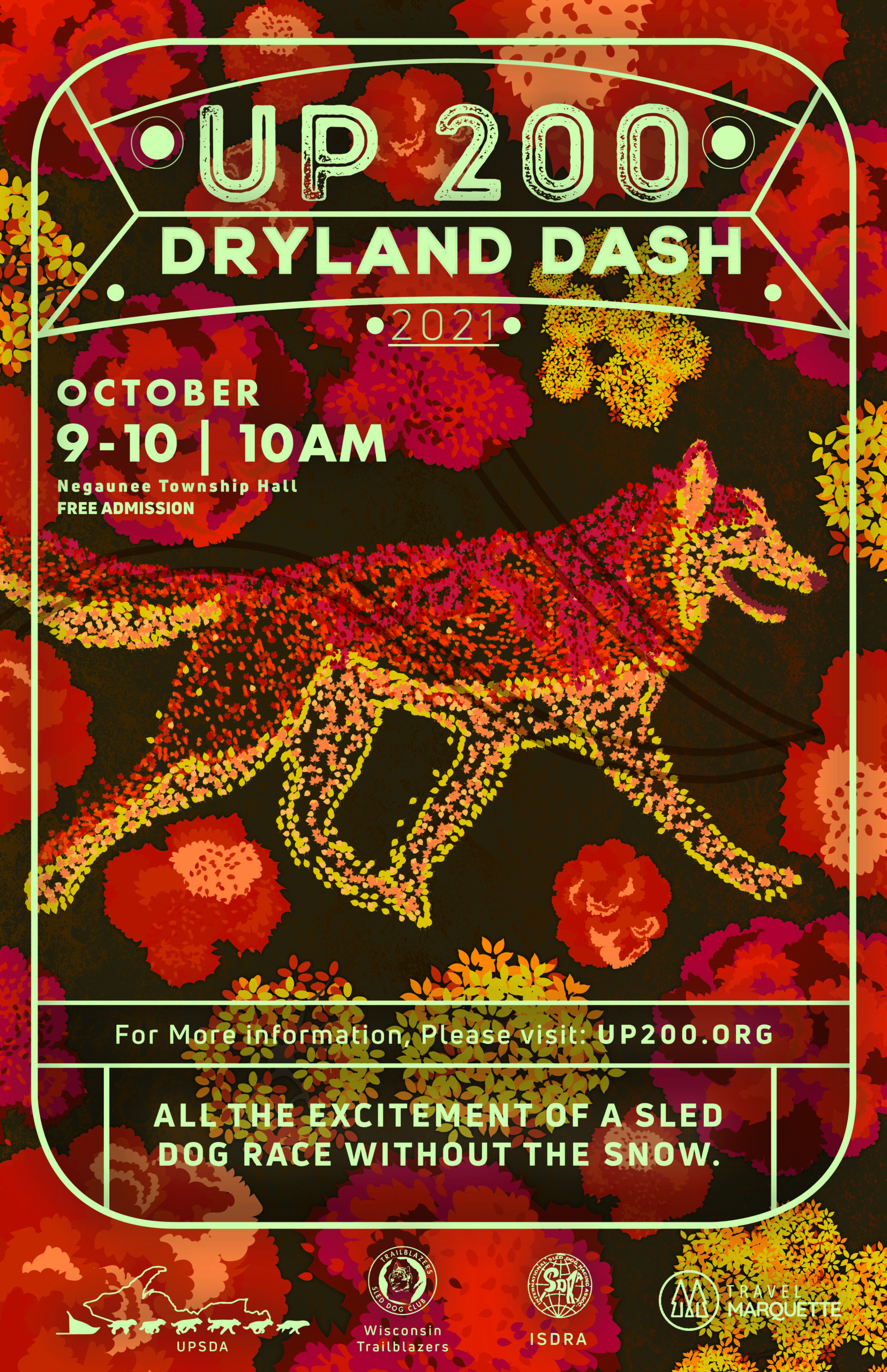 We wanted to give this poster a warm Fall motif. Instead of doing a standard design, we created the dog and the entire design out of individual leaf shapes. Zoom in and check out that detail! Design by collective member Joel Siegel.