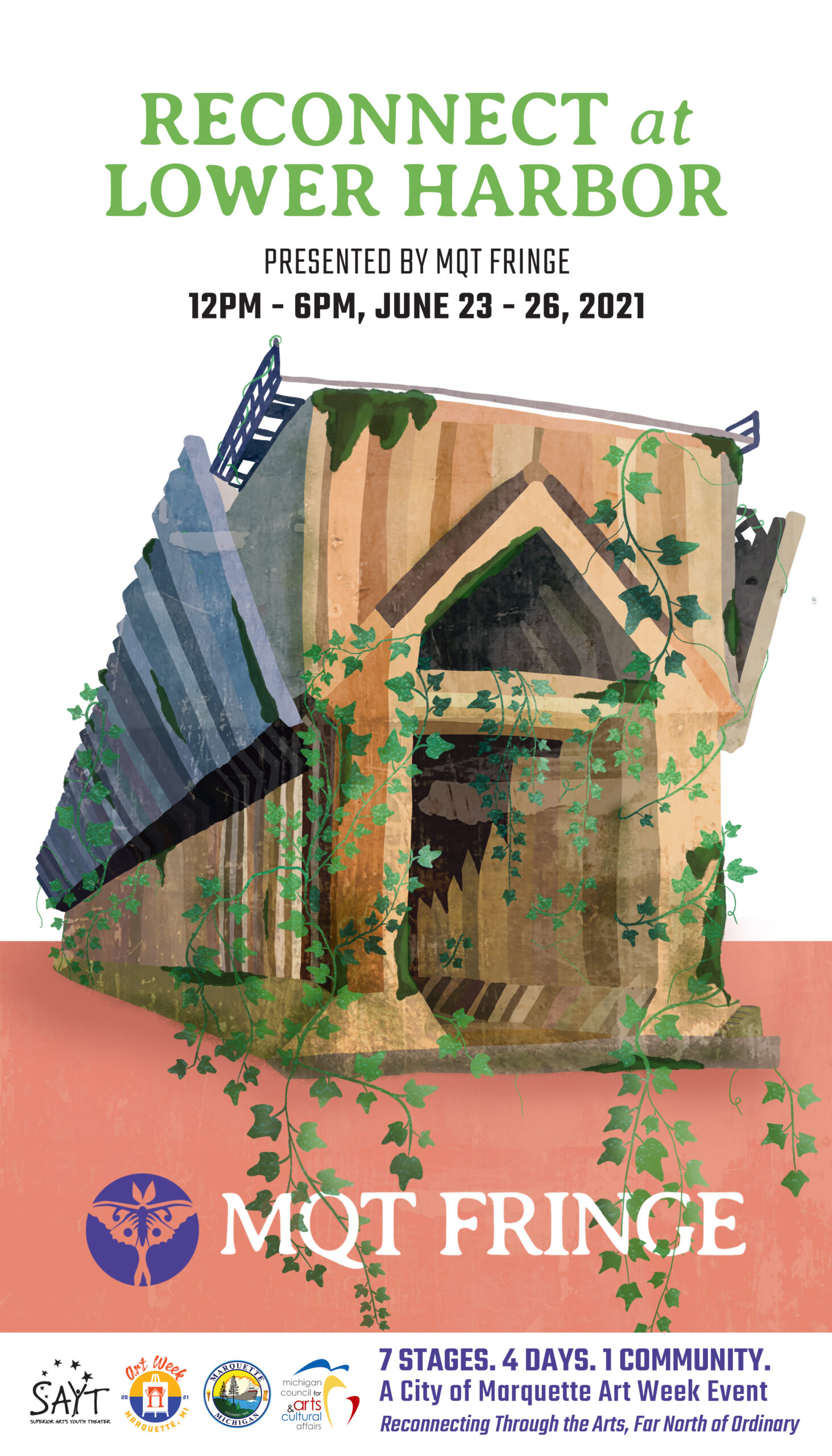 The MQT Fringe wanted a poster for Art Week that had the iconic Ore Dock 'reconnecting' back with nature. Design by collective member Dinele Stewart.