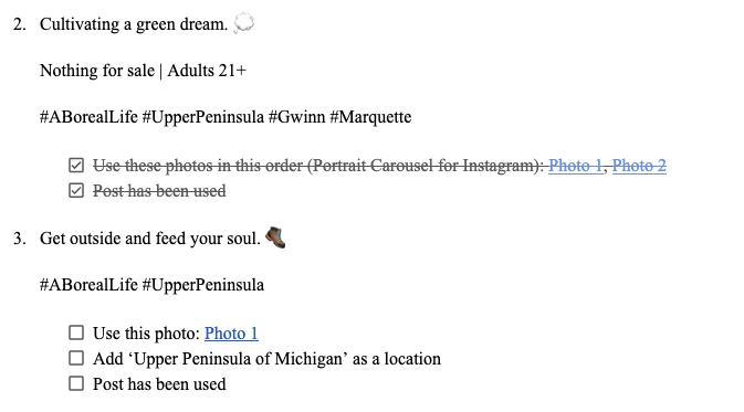 As we develop your content, we’ll be sure to check in so that you can review our progress. This ensures that the content we’re creating is still aligned with your vision. Below you will find a screenshot of the interactive document that we’ve shared with Boreal Cannabis. This document will contain your copy, direct links to your assets, a basic checklist, and specific instructions for posting. When it comes to actually posting, things can quickly become overwhelming, which is why we’re always happy to answer any questions you may have!